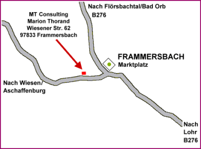 Nach Ortseingang Frammersbach ca. 2 km auf der B 276 bis zum Marktplatz, dort links Richtung Aschaffenburg/ Schöllkrippen. Nach ca. 300 m finden Sie auf der rechten Straßenseite unser Büro in der Wiesener Str. 62.
